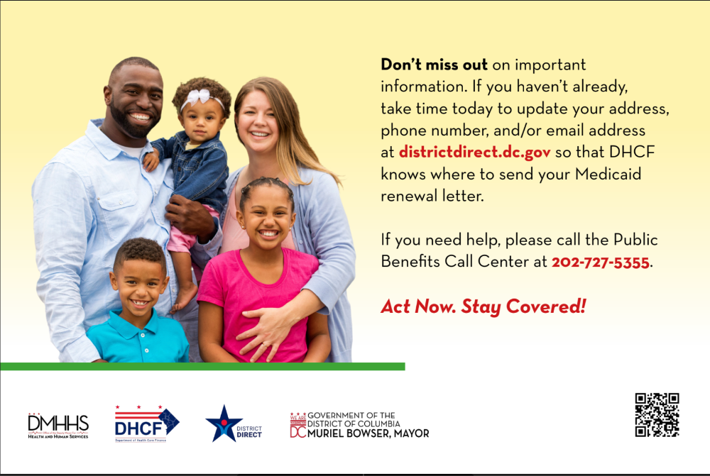 The District hosts monthly trainings and biweekly community meetings on the Medicaid Renewal process to train frontline staff and stakeholders and to connect with beneficiaries affected by the restart of Medicaid eligibility redeterminations. To join an upcoming training or meeting, please visit the Medicaid Renewal website. If you have a community meeting or event that you want to invite District staff to attend to help raise awareness, please email [email protected]. As of April 1, 2023, all Medicaid beneficiaries should renew their health coverage by or before June 30, 2024. Redeterminations of eligibility in the Alliance and Immigrant Children’s Program started in July 2022.