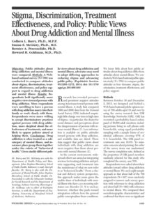 Research has revealed pervasive and persistent negative attitudes among Americans toward persons with mental illness. A study that compared 1999 and 2006 data from the General Social Survey (GSS) indicated surprisingly little change over time in high rates of stigma—in particular, the desire for social distance and perceptions about the dangerousness of persons with serious mental illness. Less information is available on public attitudes toward persons with drug addiction, and available data are dated. These data suggest that public views about individuals with drug addiction are more negative than those about persons with mental illnesses. In the current environment, widespread efforts are aimed at integrating services for treating addiction and policies supporting such treatment into the mainstream of what we now refer to as “behavioral health.” From a clinical and delivery system perspective, this approach makes sense given the sizable share of individuals with mental illness who have a co-occurring substance use disorder. It is unclear, however, whether this push toward integration reflects how the general public conceptualizes these conditions. We know little about how public attitudes about drug addiction differ from attitudes about mental illness. We conducted a Web-based national public opinion study (N5709) to compare public attitudes in four domains: stigma, discrimination, treatment effectiveness, and policy support.